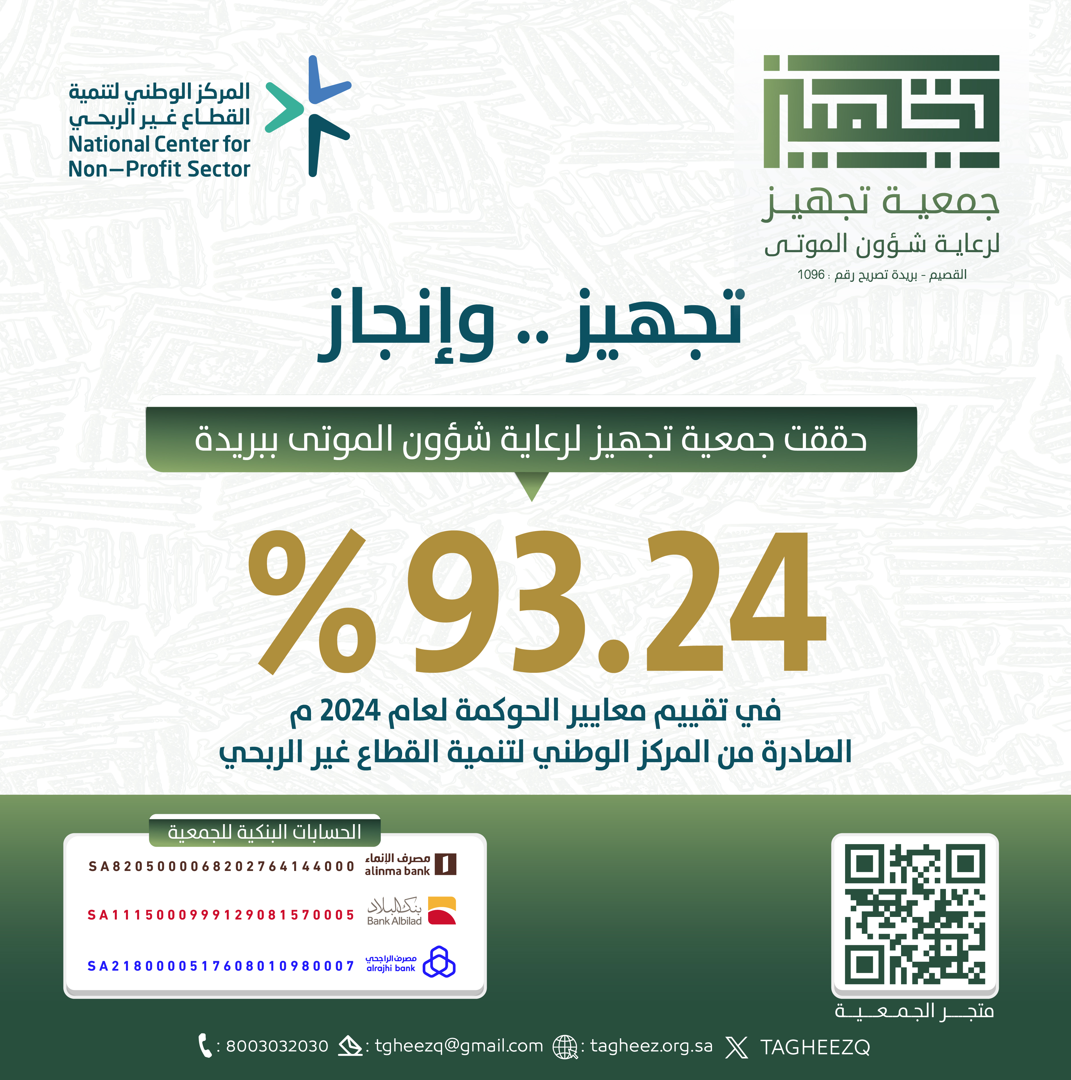بفضل الله وتوفيقه ثم بتكاتف الجهود والعمل الدؤوب حققت جمعية تجهيز لرعاية شؤون الموتى ببريدة درجة 93.24% في تطبيق معايير الحوكمة من المركز الوطني لتنمية القطاع غير الربحي .