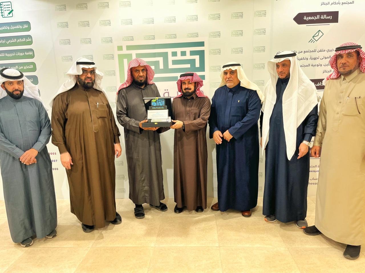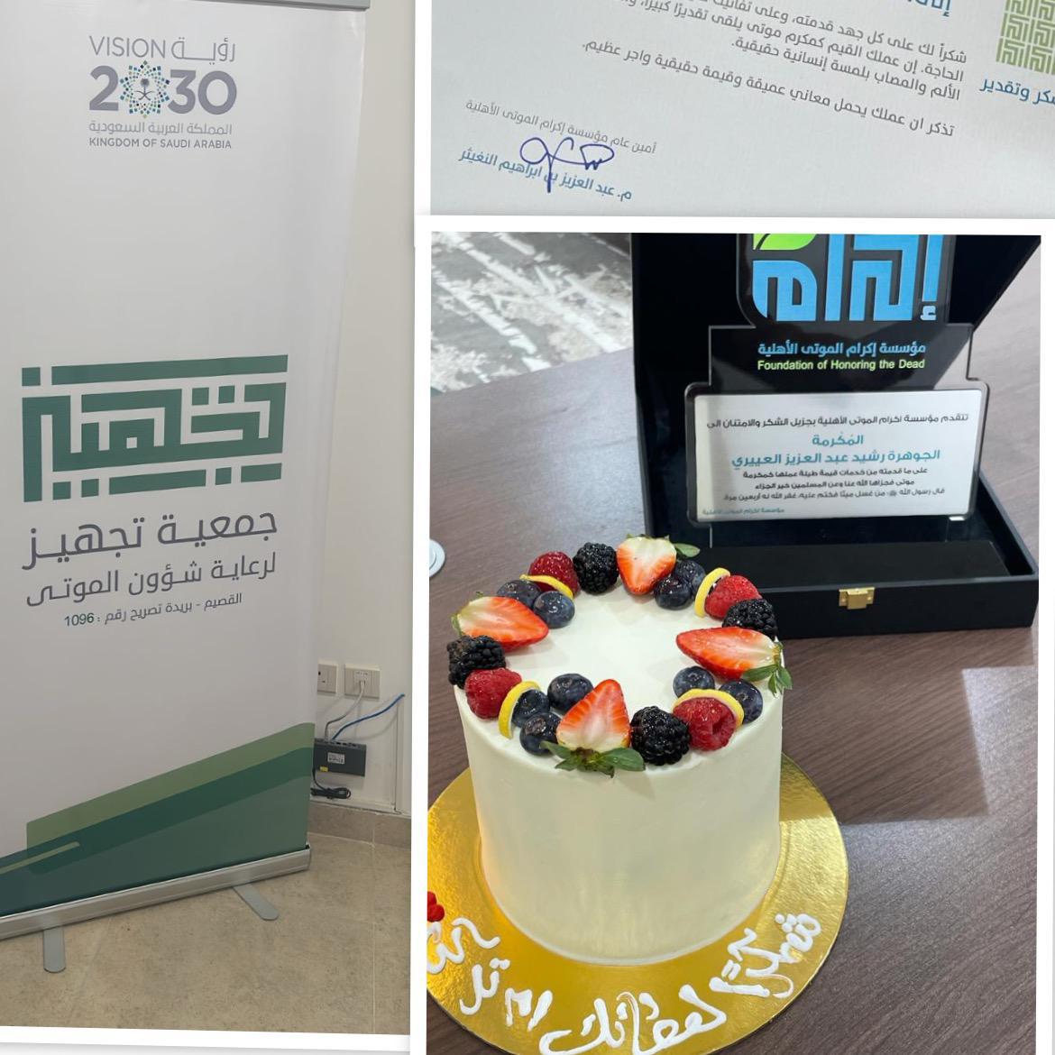 ضمن خطة جمعية تجهيز ببريدة وبالتعاون مع مؤسسة إكرام الموتى الأهلية في دعم وتكريم العاملين في مجال إكرام الموتى. قدم رئيس مجلس الإدارة المهندس عبدالعزيز بن محمد المهوس وأعضاء المجلس درعاً تقديرياً وشهادة شكر قدمت من قبل مؤسسة إكرام الموتى الأهلية لمكرم الموتى الأخ/ أحمد بن إبراهيم المقيطيب ومكرمة الموتى الأخت/ الجوهرة بنت رشيد العييري، على جهودهم وتميزهم بعملهم في مجال إكرام الموتى وخدمة المجتمع في هذا المجال.