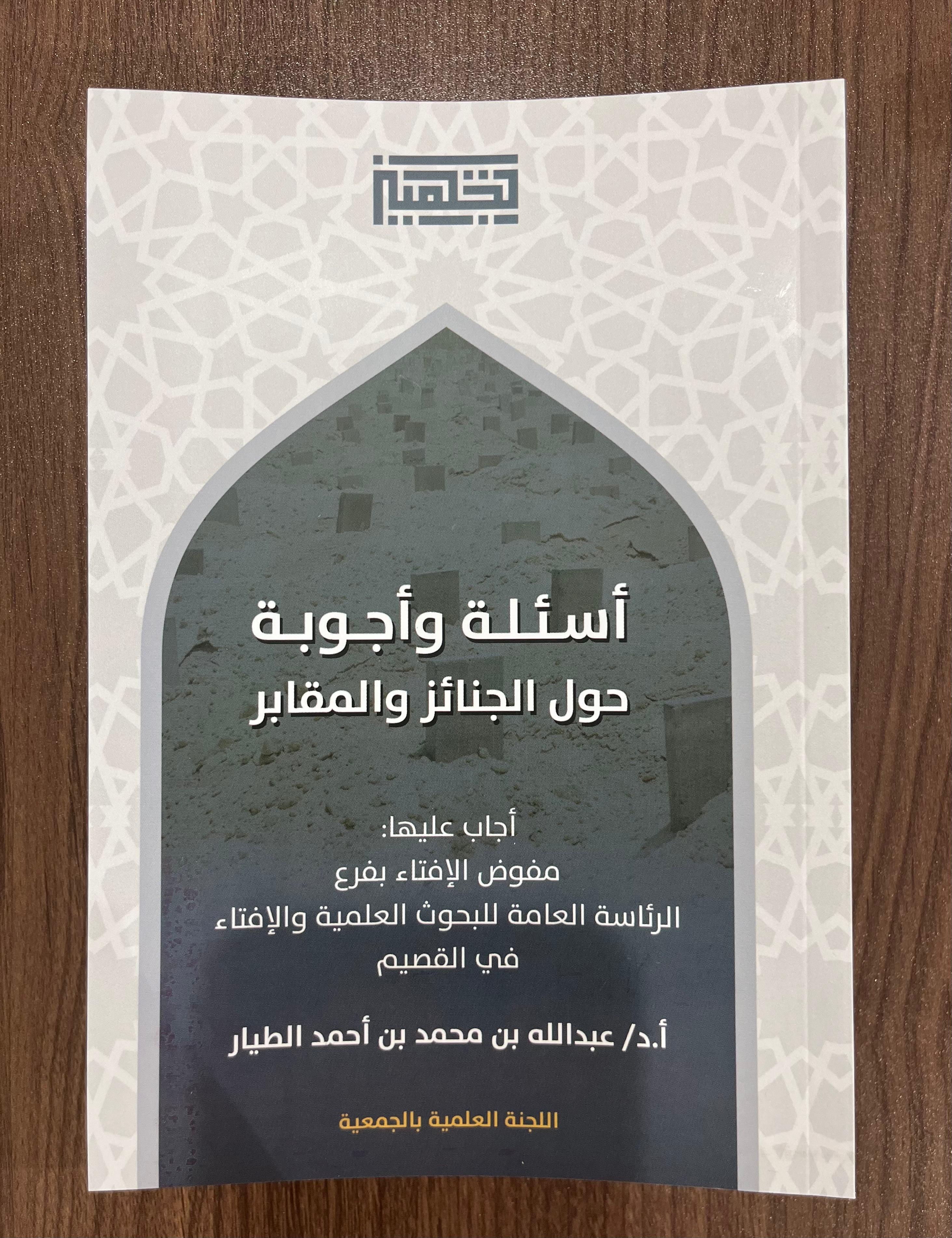 انطلاقاً من دور الجمعية في تحقيق هدفها الاستراتيجي في نشر الوعي الشرعي في احكام الجنائز والمقابر، طبعت الجمعية كتاب "أسئلة وأجوبة حول الجنائز والمقابر" أجاب عليها فضيلة الشيخ أ.د/ عبدالله بن محمد الطيار (مفوض الإفتاء بفرع الرئاسة العامة للبحوث العلمية والإفتاء بفرع القصيم). كما قامت لجنة العلاقات والأعلام بالجمعية بالعمل على توزيع وإهداء نسخ من الكتاب للجمعيات المماثلة للاستفادة مما فيه من علم شرعي يساهم في نشر الوعي الشرعي في مجال اكرام الموتى.