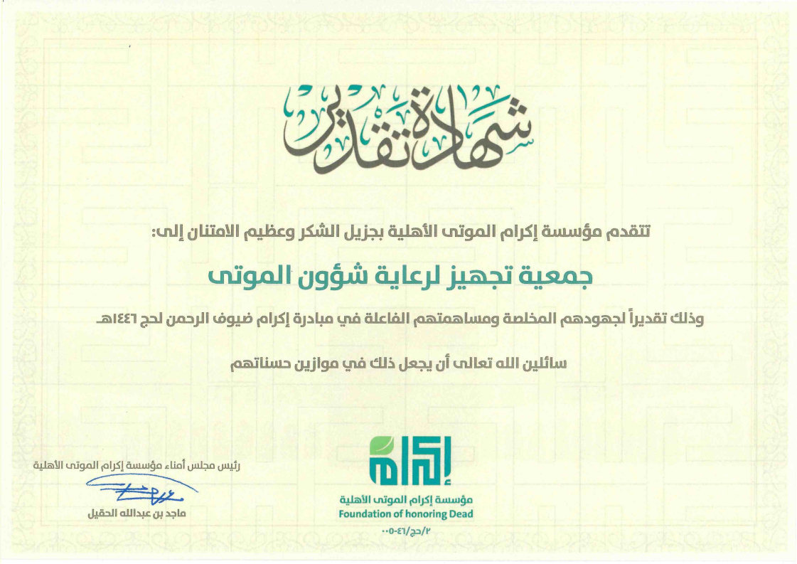 تلقت جمعية تجهيز لرعاية شؤون الموتى ببريدة خطاب وشهادة شكر وتقدير من معالي رئيس مجلس أمناء مؤسسة إكرام الموتى الأهلية الأستاذ / ماجد بن عبدالله الحقيل وذلك تقديراً لمساهمتنا في مبادرة إكرام ضيوف الرحمن لموسم حج عام 1446هـ فلهم منا جزيل الشكر والعرفان .