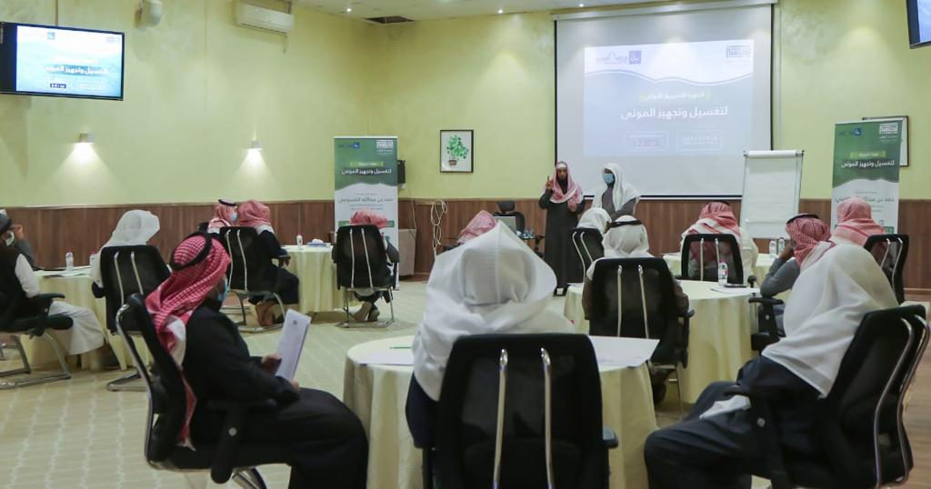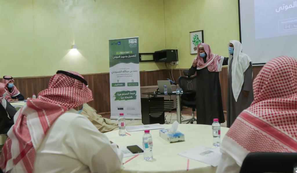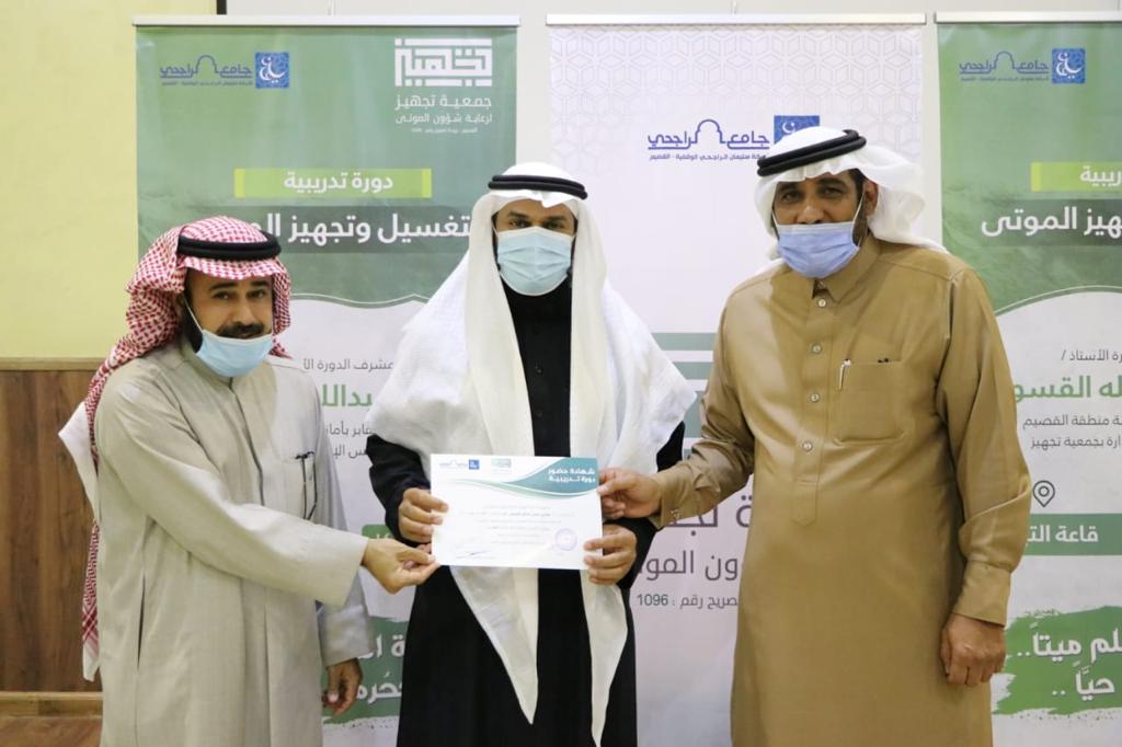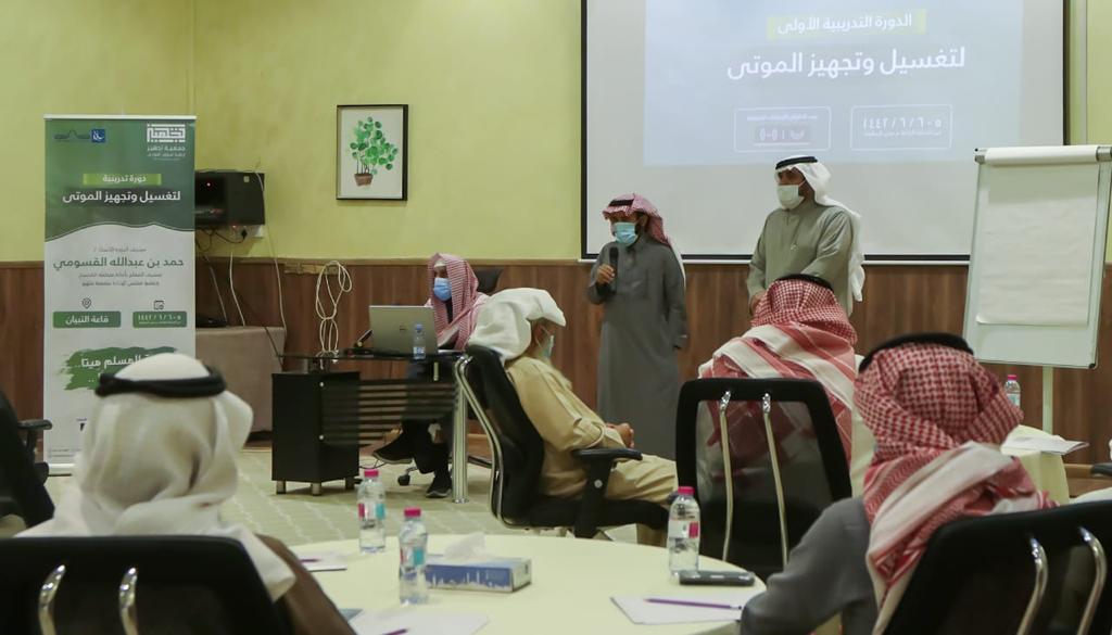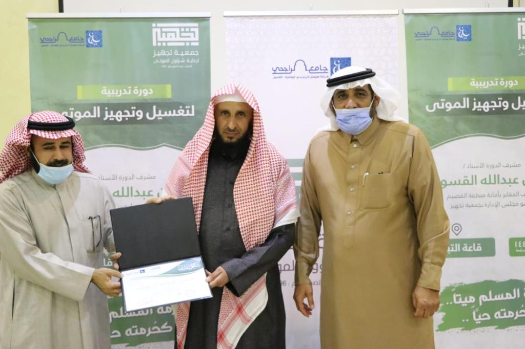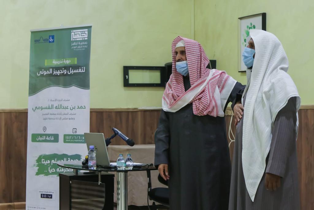 بناء على موافقة سمو أمير منطقة القصيم الدكتور/ فيصل بن مشعل آل سعود حفظه الله ودعماً لبرامج خدمة المجتمع. تم إقامة الدورة التدريبية الأولى ( لتغسيل وتجهيز الموتى) في قاعة التبيان التابعة لشركة الراجحي الوقفية ببريدة. تم بحمدالله اختتام الدورة يوم أمس الثلاثاء الموافق ٦/ ٦/ ١٤٤٢ هـ بواقع يومين لمدة ست ساعات تدريبية . وقد كان برنامج الدورة يتكون من جزئين نظري و عملي .. وفي نهاية الدورة قام رئيس مجلس إدارة جمعية تجهيز المهندس/ عبدالعزيز بن محمد المهوس بتوزيع شهادات الدورة على المتدربين وتكريم عضو مجلس الإدارة الأستاذ / حمد بن عبدالله القسومي على تقديمه والقاءه لهذه الدورة .